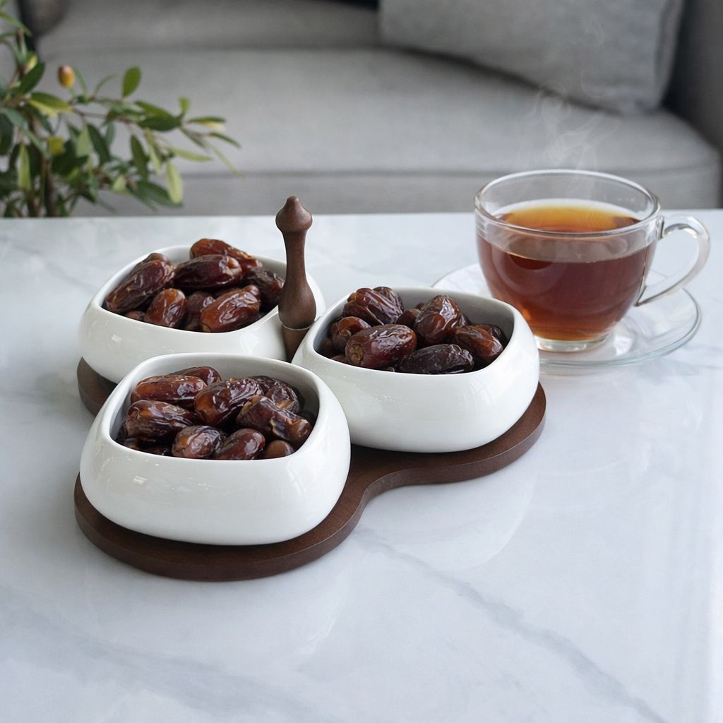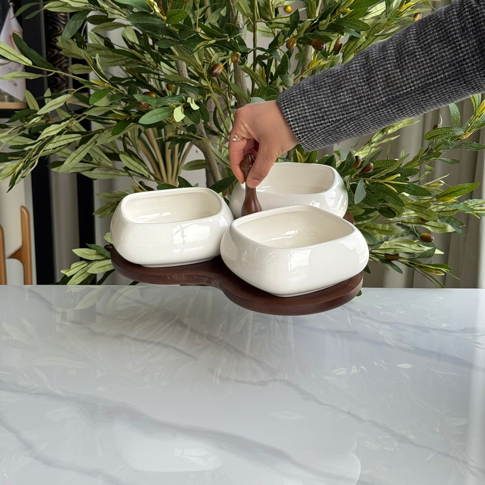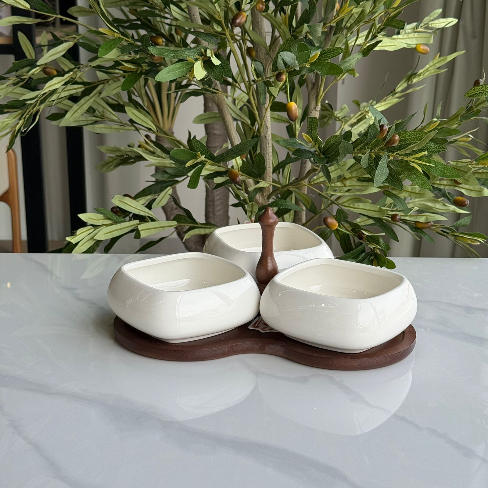 طقم أوعية تقديم سيراميك مكون من 3 قطع مع حامل خشبي |