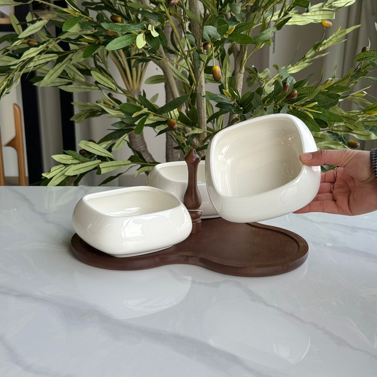 طقم أوعية تقديم سيراميك مكون من 3 قطع مع حامل خشبي