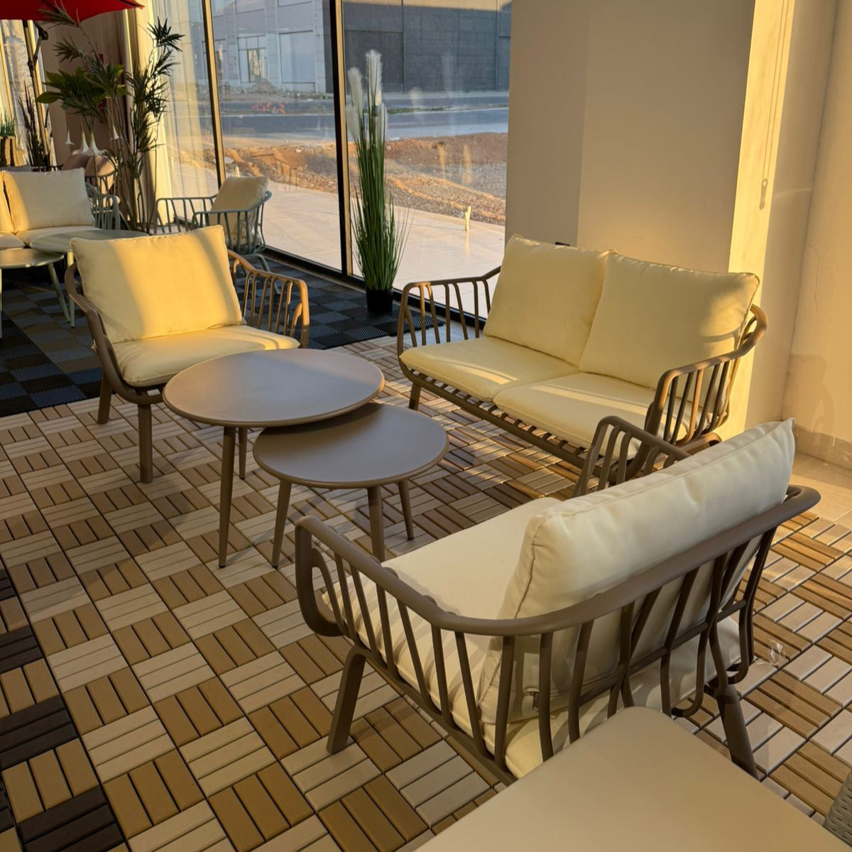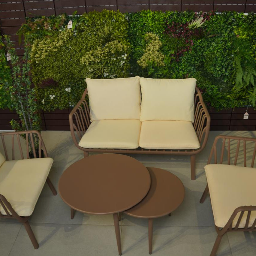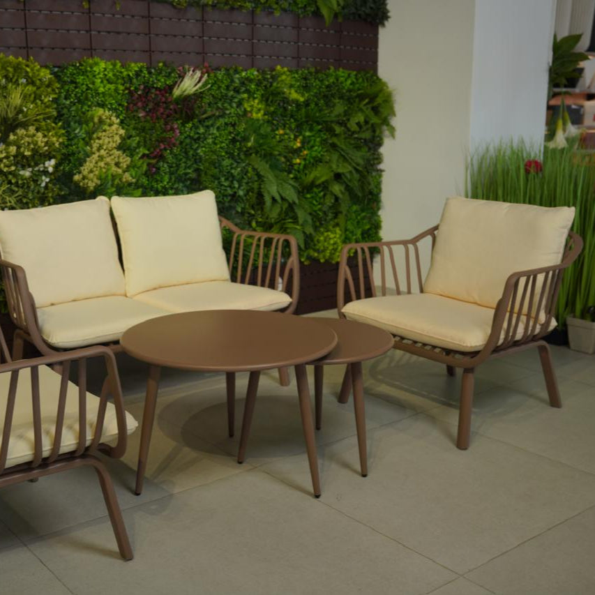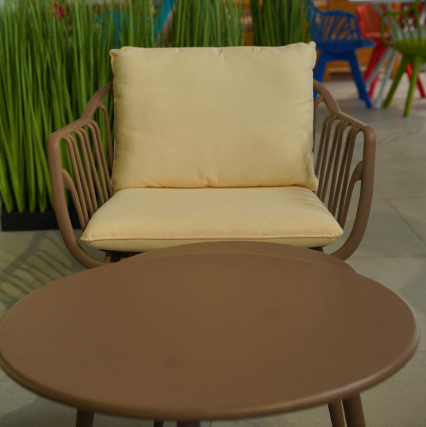مجموعة الأثاث الخارجي الحديثة مصنوعة من البلاستيك عالي الجودة مضاد للارتداء مع أرجل معدنية. تختلف عن المجموعات البلاستيكية التقليدية الأخرى التي نعتمدها تصميم مفتوح فريد.