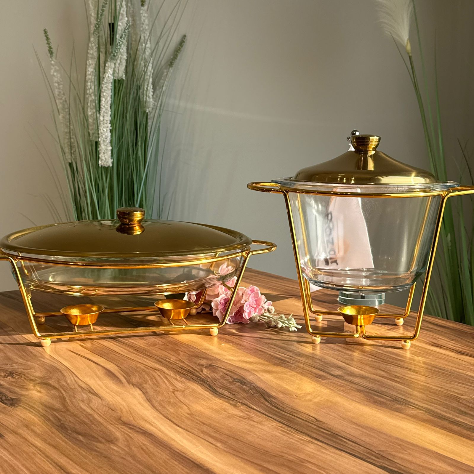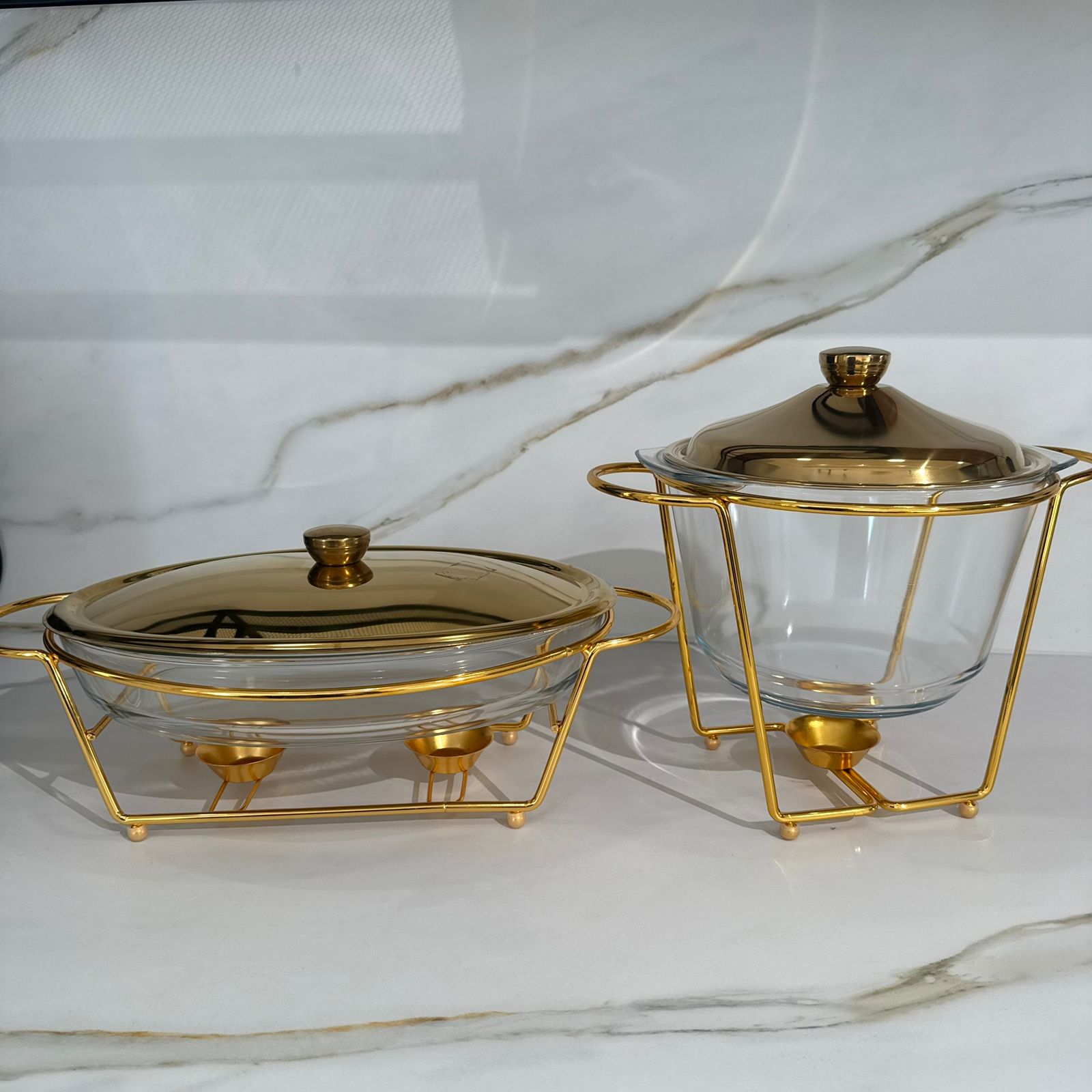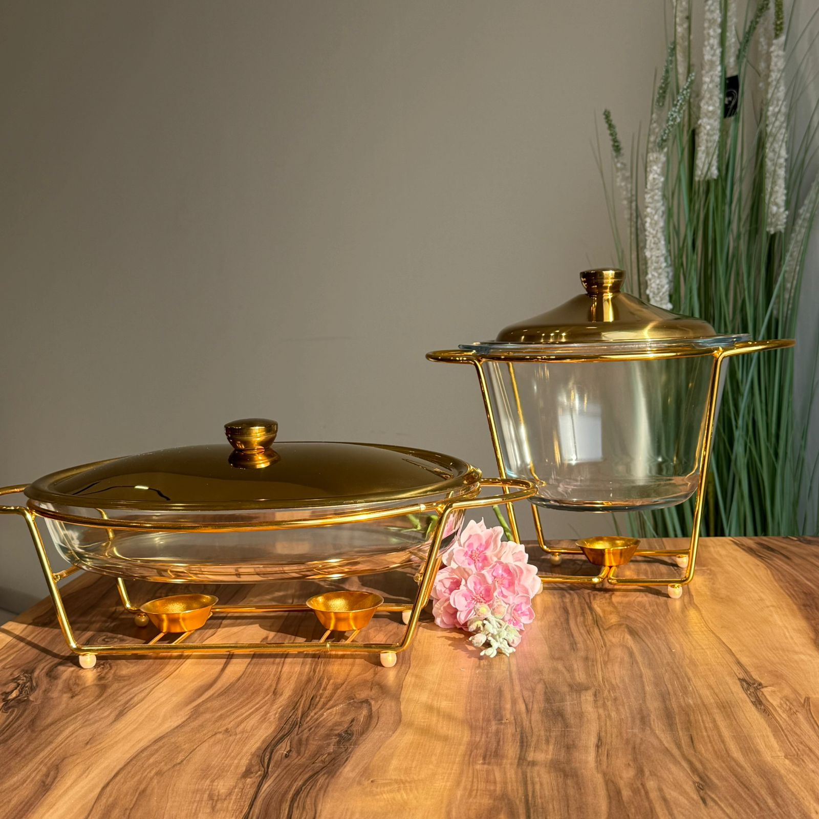 مجموعة أطباق تقديم الطعام الزجاجية الذهبية الفاخرة - تصاميم بيضاوية ودائرية |
