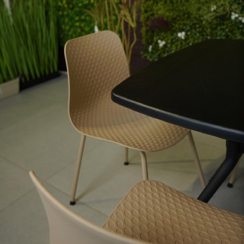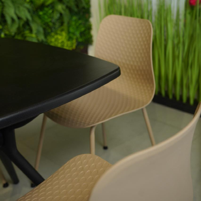 يتميز الكرسي بسطح جلوس ناعم يجمع بين البلاستيك والجمال، ومثبت بأرجل معدنية متينة وجميلة.