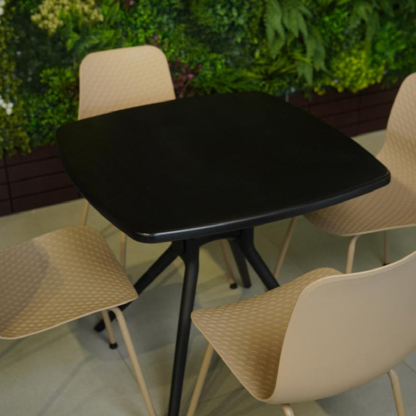 طاولة بلاستيكية عملية مصنوعة بسطح مربع وحواف منحنية.