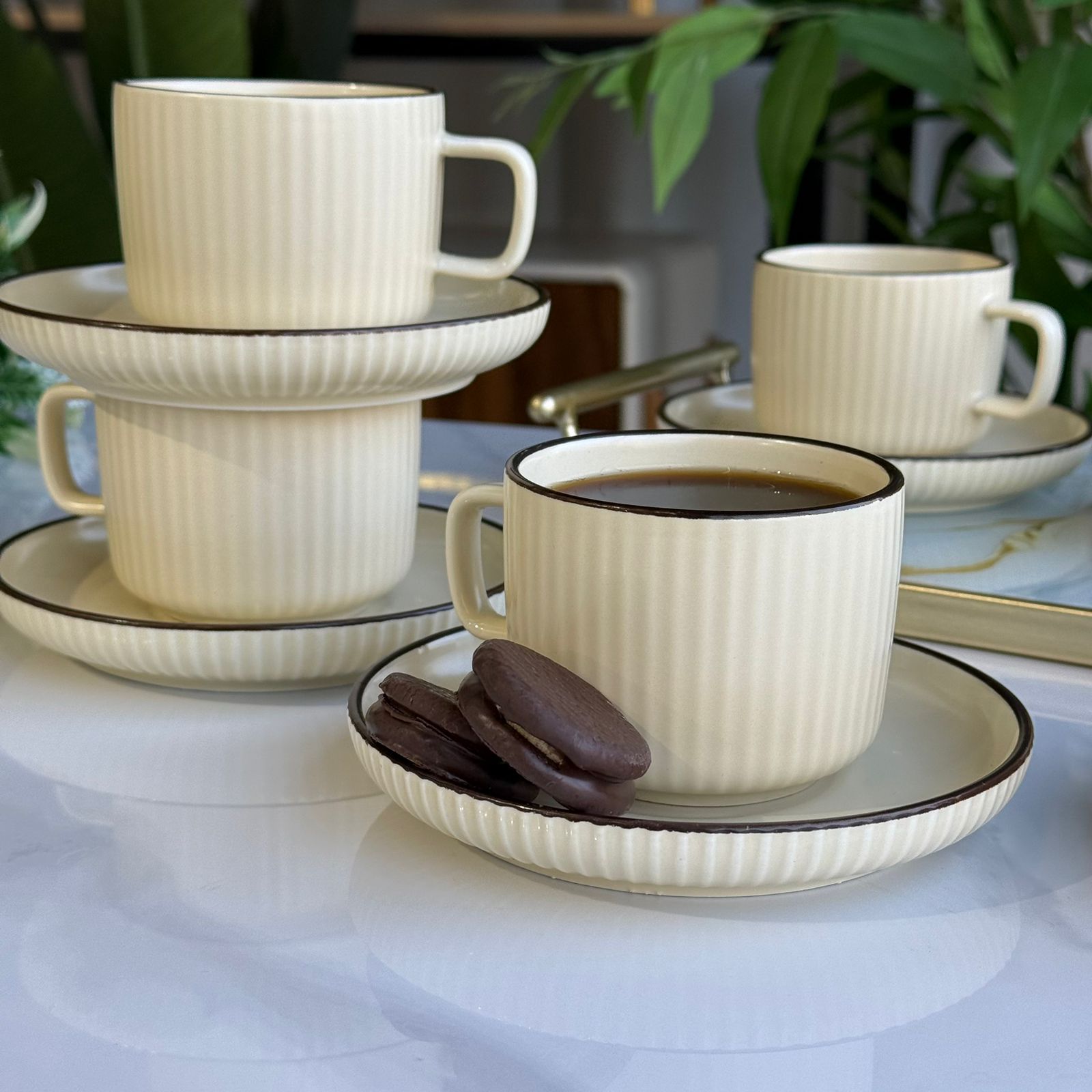 • کوپێکی قاوە و دەفرێکی ڕەسەن کە لە سیرامیکی کوالێتی بەرز دروستکراوە، دیزاینێکی بێ کات و تەواو بۆ بەکارهێنانی ڕۆژانە یان بۆنە تایبەتەکانی تێدایە.