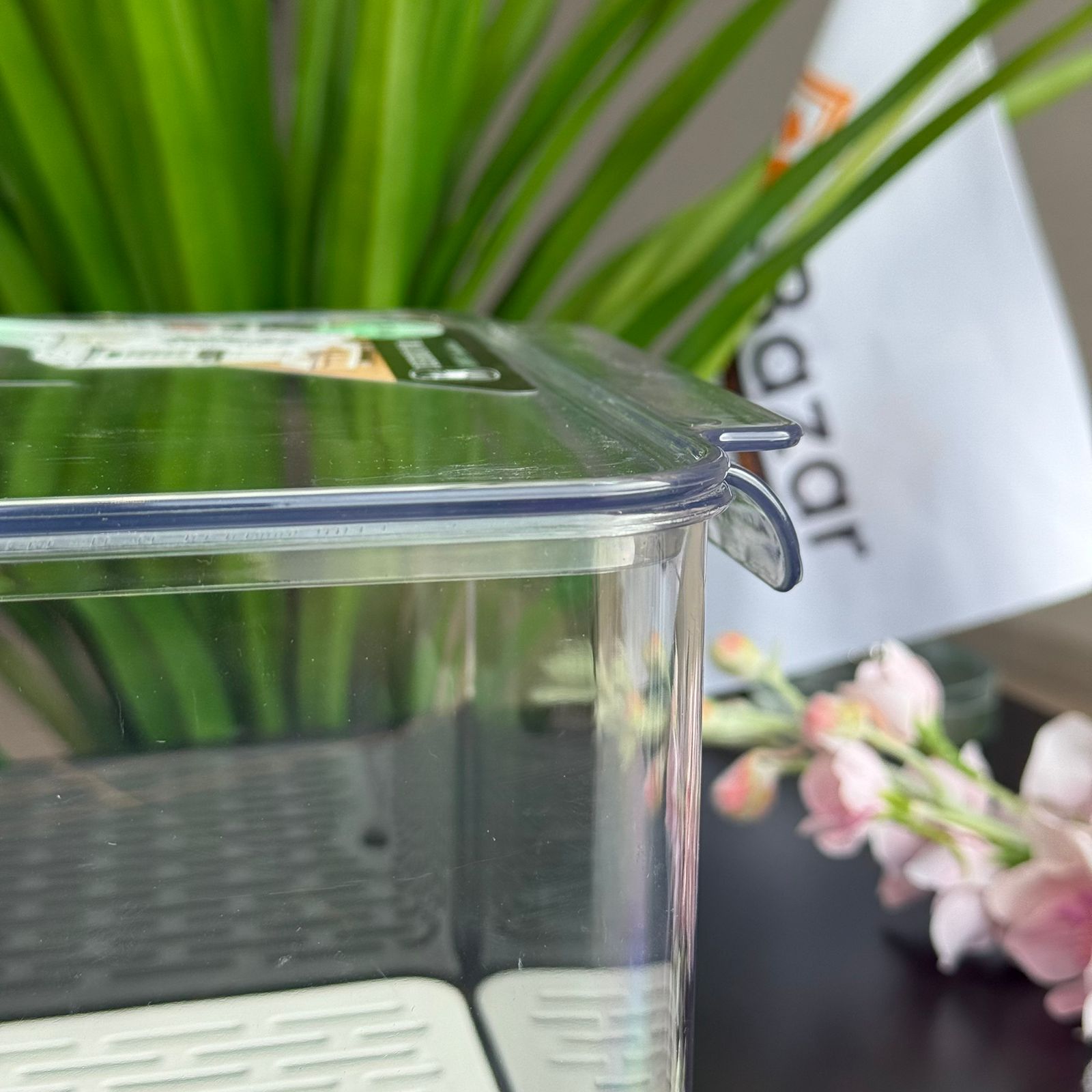 It has a durable drain tray on the base with many holes which helps separating water from the goods and keep them fresh. The box can be used for refrigerator or freezer, pantry, cabinets, shelves and kitchen countertop.