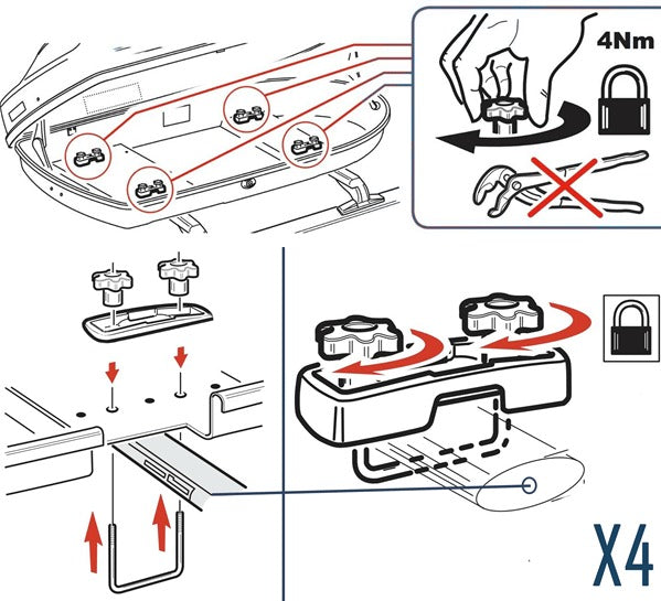 - just put each U-bolt through the metal brackets underneath the cargo unit, there are 4 U-bolts in total.