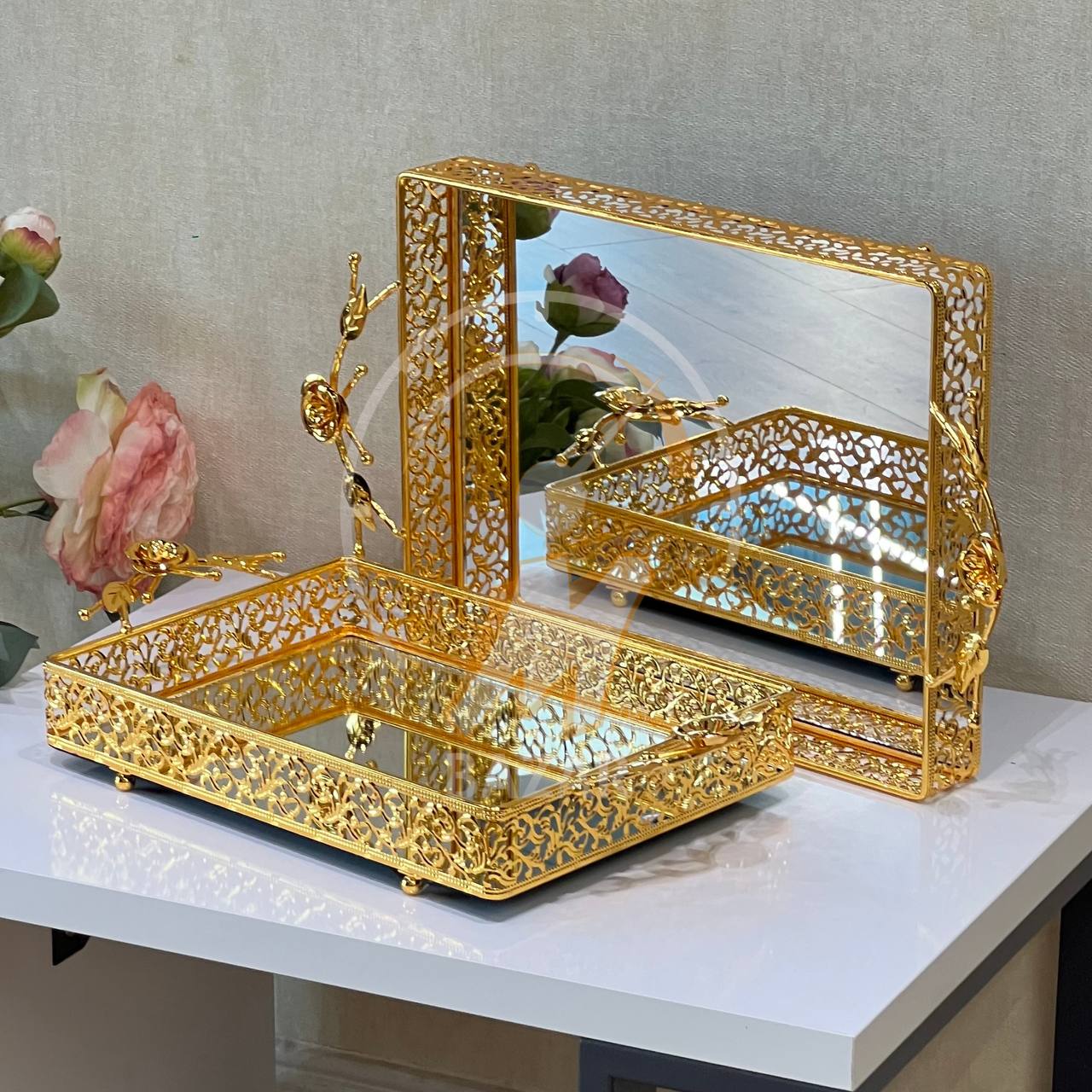 Luxury Decorative Gold Mirror Trays are made of metal and finished with an elegant mirrored glass surface, which is elegant and sturdy. The intricate detailing and vintage aesthetic of this tray make it a standout piece that adds a touch of elegance and charm to any space.