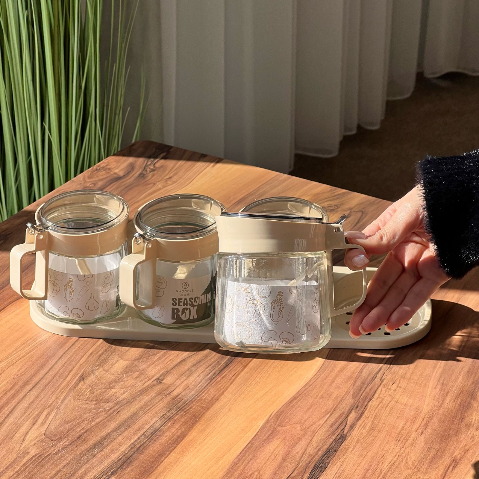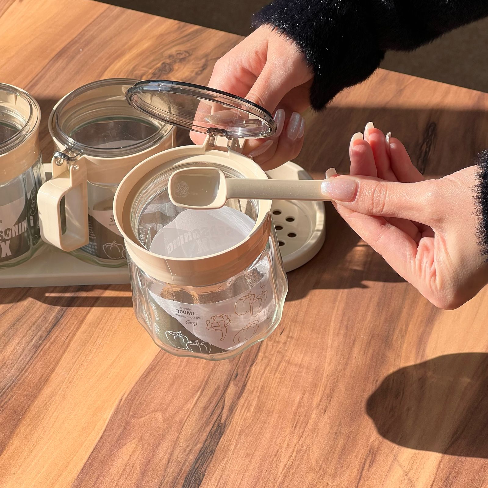 The seasoning box set made of high quality material, great for storing and preserving a variety of ingredients including preserves, sugar, tea, coffee, herbs, spices, etc. In addition, dried flowers, such as dried lavender flowers and rosebuds.