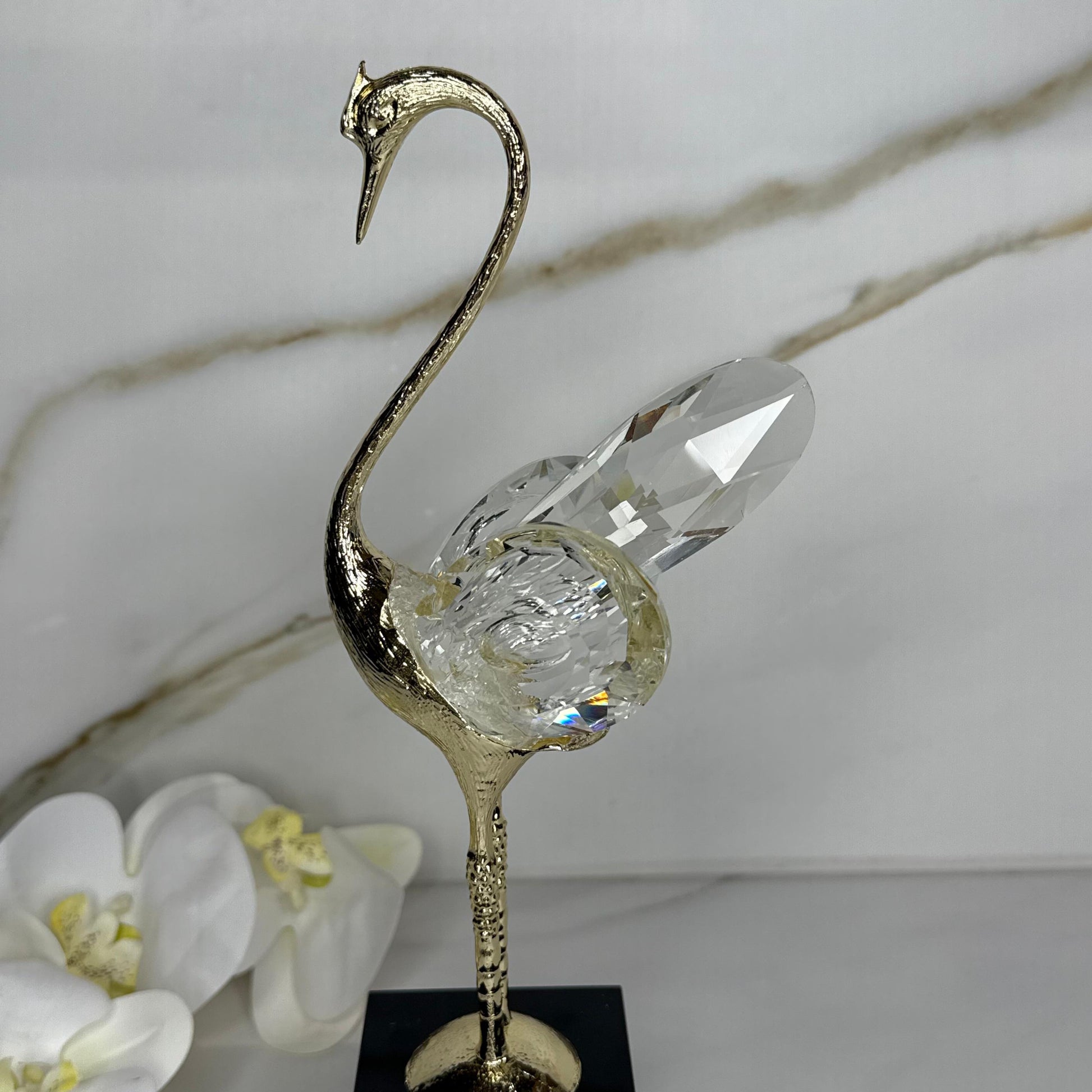 - Swan-Inspired Design With A Graceful, Curved Neck, Faceted Crystal Wings That Reflect Light Beautifully - Durable Material – Made From Sturdy Materials - Gold-Toned Metal For A Premium, Sophisticated Appearance - Stable Base – Mounted On A Glossy Black Square Base For Stability - Elegant Shape – Designed To Complement Home Decor Styles - Versatile Placement – Ideal For Living Rooms, Bedrooms, Entryways, Offices, Or Event Decor - Statement Piece – Can Act As A Focal Point In A Room Or Setting - Unique Detailing – Adds A Touch Of Individuality And Craftsmanship - Artistic Craftsmanship – Sculpted With Attention To Fine Details And Form - Crystal Tail Design – Features Multi-Faceted Elements That Catch And Refract Light - Lustrous Finish – Smooth And Shiny Surface Enhances Visual Appeal - Compact Size – Fits Easily On Shelves, Side Tables, Or Desktops Without Overcrowding - Symbol Of Elegance – Swans Often Represent Love, Grace, And Beauty In Home Decor - Handmade Feel – Each Piece May Have Slight Variations, Adding To Its Uniqueness - No Assembly Required – Ready To Display Straight Out Of The Box - Low Maintenance – Simply Wipe With A Soft Cloth To Maintain Shine - Blends With Various Decor Themes – Suitable For Modern, Classic, Or Glamorous Interiors