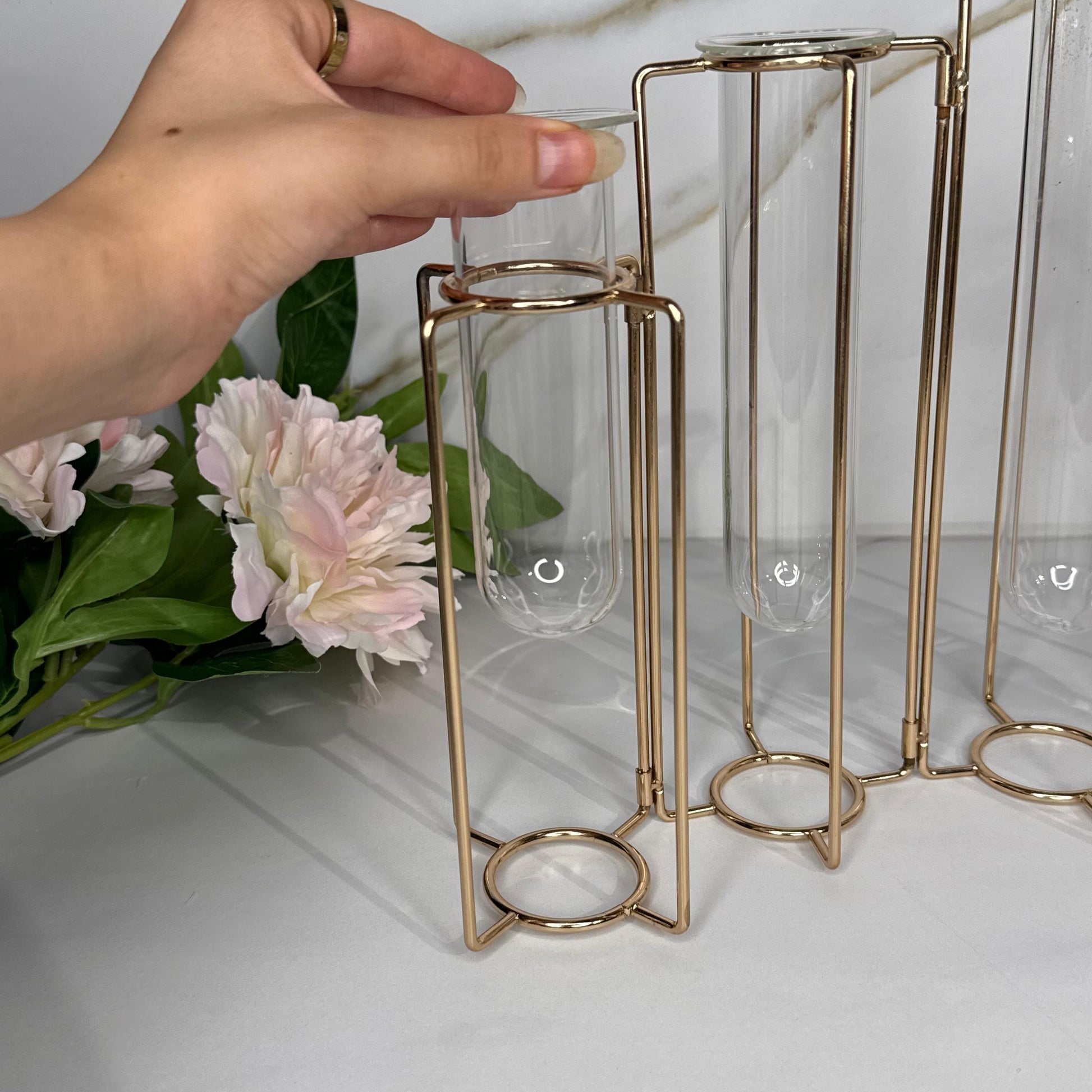 - Foldable Frame: The flower vase set is comprised of 5 individual flower tubes hinged together, they can be bent and contorted into various shapes such as lines, curves and clusters, supported by a connected gold metal frame |