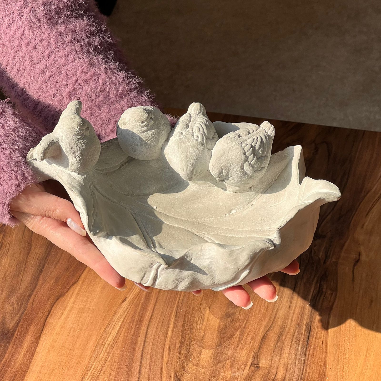 Decorative bird bath design with birds that is suitable as a drinking trough or bath for a wide range of wild bird species.