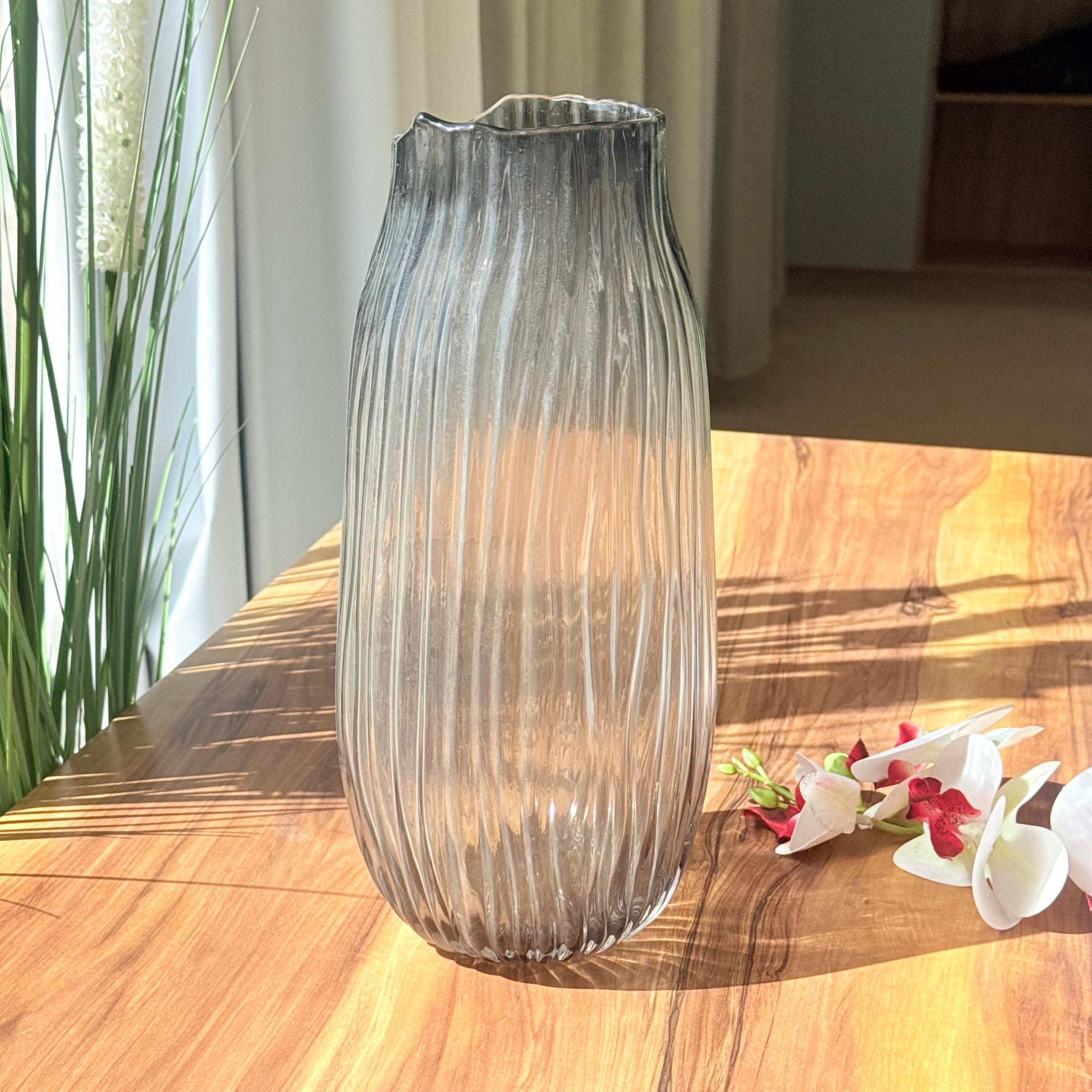 - Durable Material – Made From Sturdy Glass For Long-Lasting Use. - Stable Base – Flat And Wide Base Prevents Tipping And Ensures Stability On Surfaces, And Protect Surfaces - Multi-Purpose Use – Can Hold Flowers, Dried Arrangements, Or Stand Alone As Decorative Art. - Elegant Shape – Designed to Complement Floral Arrangements And Home Decor Styles. -Versatile Placement – Ideal For Living Rooms, Bedrooms, Entryways, Offices, Or Event Decor. - Lightweight Design – Easy to move and reposition as needed. - Wide Opening – Accommodates various bouquet sizes, branches, or ornamental objects. - Statement Piece – Can Act As A Focal Point In A Room Or Setting, Eye-Catching Design That Works As A Standalone Piece Or With Faux Florals - Handcrafted & Unique Detailing – Adds a touch of individuality and craftsmanship. - Gifting - Ideal For Home Decor Or Gifting, Could Be A Perfect Gift For Your Loved Ones