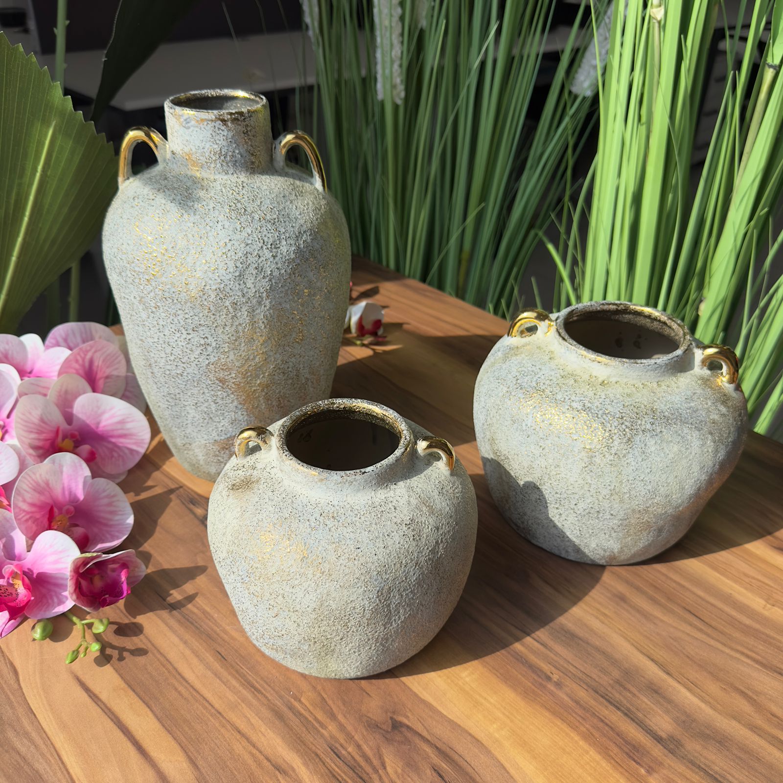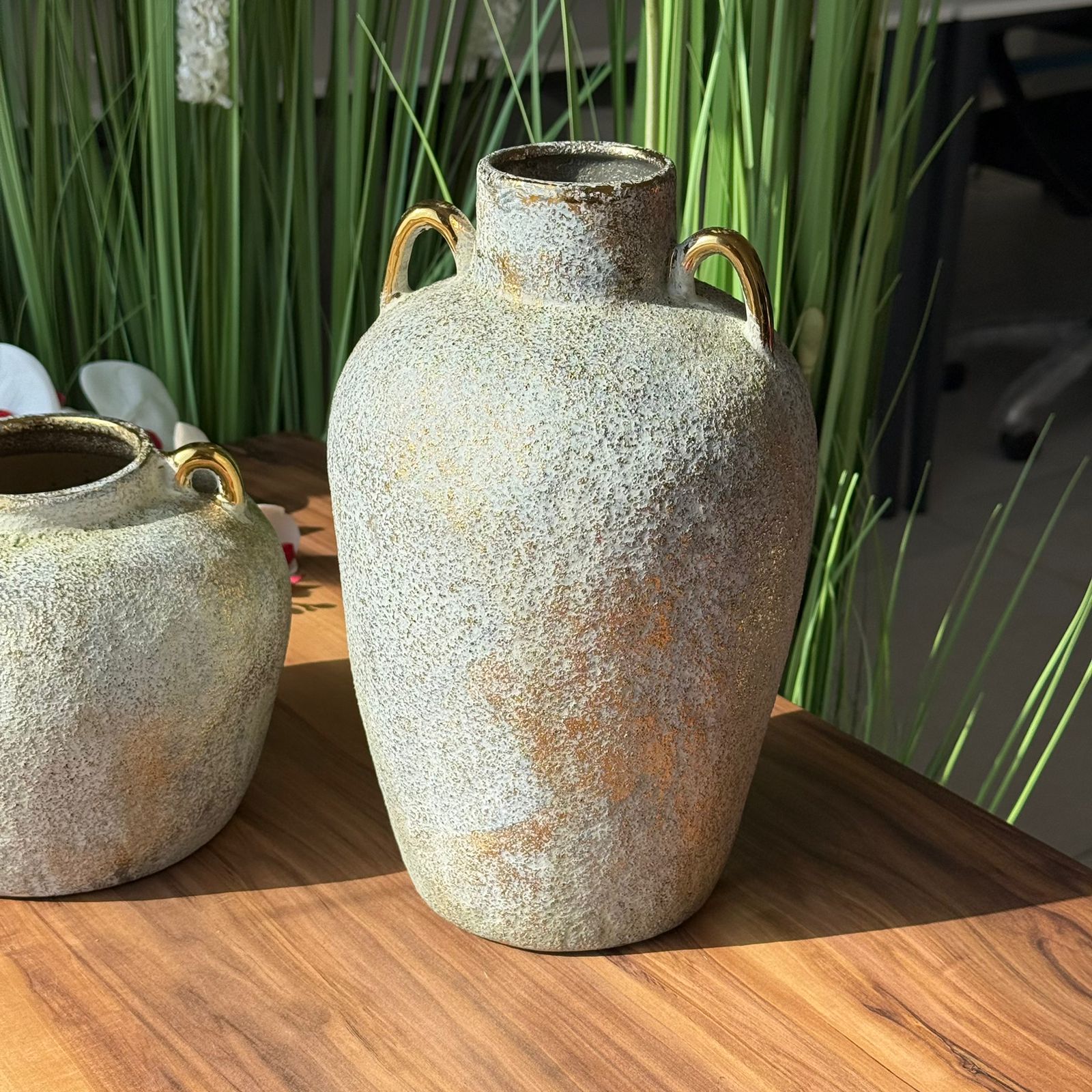 | Key Features: | -Distressed Stone-Like Texture With An Antique Finish -Golden-Hued Handles For A Touch Of Luxury -Inspired By Traditional Earthenware Storage Jars -Artistic Design, Eye-Catching, Suitable For Modern, Minimalist, Or Floral-Themed Interior -Ideal For Home Decor Or Gifting |
